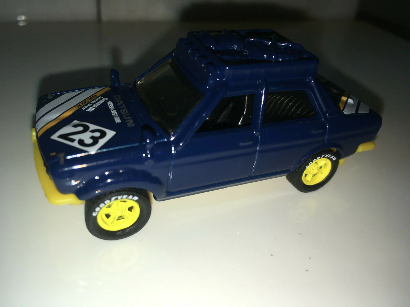 2019 MATCHBOX MBX OFF ROAD BLUE ‘70 Datsun 510 Rally SUPER CUSTOM with GOODYEAR/YELLOW real rider style rubber tires and Yellow plastic rims. Please see all photos of this unit as this is a custom build, it rolls but was not built for that and was built as a display/custom show piece. unit was re-tapped, re-screwed with a hex .This is a SUPER CUSTOM ONE OF A KIND.